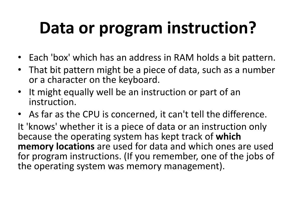 Data or program instruction? • Each 'box' which has an address in RAM holds a bit pattern. • That bit pattern might be a piece of data, such as a number or a character on the keyboard. • It might equally well be an instruction or part of an instruction. • As far as the CPU is concerned, it can't tell the difference. It 'knows' whether it is a piece of data or an instruction only because the operating system has kept track of which memory locations are used for data and which ones are used for program instructions. (If you remember, one of the jobs of the operating system was memory management).
