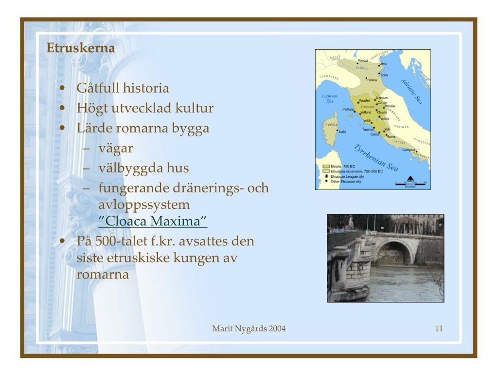 Etruskerna • Gåtfull historia • Högt utvecklad kultur • Lärde romarna bygga • vägar • välbyggda hus • fungerande dränerings- och avloppssystem”Cloaca Maxima” • På 500-talet f.kr. avsattes den siste etruskiske kungen av romarna Marit Nygårds 2004