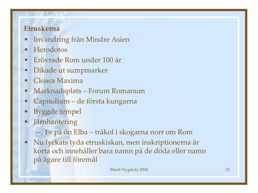 Etruskerna • Invandring från Mindre Asien • Herodotos • Erövrade Rom under 100 år • Dikade ut sumpmarker • Cloaca Maxima • Marknadsplats – Forum Romanum • Capitolium – de första kungarna • Byggde tempel • Järnhantering • Fe på ön Elba – tråkol i skogarna norr om Rom • Nu lyckats tyda etruskiskan, men inskriptionerna är korta och innehåller bara namn på de döda eller namn på ägare till föremål Marit Nygårds 2004