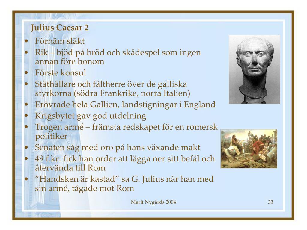 Julius Caesar 2 • Förnäm släkt • Rik – bjöd på bröd och skådespel som ingen annan före honom • Förste konsul • Ståthållare och fältherre över de galliska styrkorna (södra Frankrike, norra Italien) • Erövrade hela Gallien, landstigningar i England • Krigsbytet gav god utdelning • Trogen armé – främsta redskapet för en romersk politiker • Senaten såg med oro på hans växande makt • 49 f.kr. fick han order att lägga ner sitt befäl och återvända till Rom • ”Handsken är kastad” sa G. Julius när han med sin armé, tågade mot Rom Marit Nygårds 2004