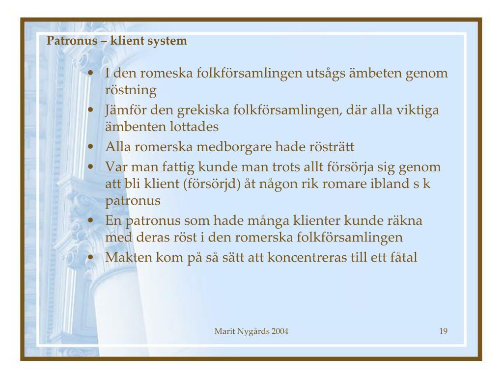 Patronus – klient system • I den romeska folkförsamlingen utsågs ämbeten genom röstning • Jämför den grekiska folkförsamlingen, där alla viktiga ämbenten lottades • Alla romerska medborgare hade rösträtt • Var man fattig kunde man trots allt försörja sig genom att bli klient (försörjd) åt någon rik romare ibland s k patronus • En patronus som hade många klienter kunde räkna med deras röst i den romerska folkförsamlingen • Makten kom på så sätt att koncentreras till ett fåtal Marit Nygårds 2004