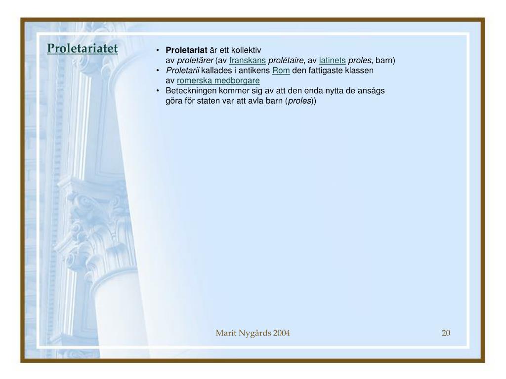 Proletariatet • Proletariat är ett kollektiv av proletärer (av franskansprolétaire, av latinetsproles, barn) • Proletarii kallades i antikens Rom den fattigaste klassen av romerska medborgare • Beteckningen kommer sig av att den enda nytta de ansågs göra för staten var att avla barn (proles)) Marit Nygårds 2004