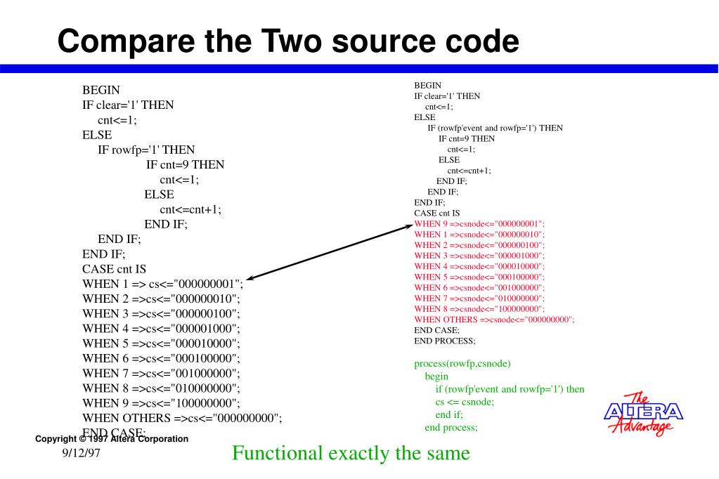 Compare the Two source code BEGIN IF clear='1' THEN cnt<=1; ELSE IF (rowfp'event and rowfp='1') THEN IF cnt=9 THEN cnt<=1; ELSE cnt<=cnt+1; END IF; END IF; END IF; CASE cnt IS WHEN 9 =>csnode<="000000001"; WHEN 1 =>csnode<="000000010"; WHEN 2 =>csnode<="000000100"; WHEN 3 =>csnode<="000001000"; WHEN 4 =>csnode<="000010000"; WHEN 5 =>csnode<="000100000"; WHEN 6 =>csnode<="001000000"; WHEN 7 =>csnode<="010000000"; WHEN 8 =>csnode<="100000000"; WHEN OTHERS =>csnode<="000000000"; END CASE; END PROCESS; process(rowfp,csnode) begin if (rowfp'event and rowfp='1') then cs <= csnode; end if; end process; BEGIN IF clear='1' THEN cnt<=1; ELSE IF rowfp='1' THEN IF cnt=9 THEN cnt<=1; ELSE cnt<=cnt+1; END IF; END IF; END IF; CASE cnt IS WHEN 1 => cs<="000000001"; WHEN 2 =>cs<="000000010"; WHEN 3 =>cs<="000000100"; WHEN 4 =>cs<="000001000"; WHEN 5 =>cs<="000010000"; WHEN 6 =>cs<="000100000"; WHEN 7 =>cs<="001000000"; WHEN 8 =>cs<="010000000"; WHEN 9 =>cs<="100000000"; WHEN OTHERS =>cs<="000000000"; END CASE; Functional exactly the same