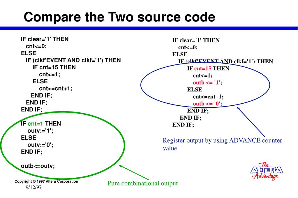 Compare the Two source code IF clear='1' THEN cnt<=0;ELSE IF (clkf'EVENT AND clkf='1') THEN IF cnt=15 THEN cnt<=1; ELSE cnt<=cnt+1; END IF; END IF;END IF; IF cnt=1 THEN outv:='1';ELSE outv:='0';END IF; outb<=outv; IF clear='1' THEN cnt<=0; ELSE IF (clkf'EVENT AND clkf='1') THEN IF cnt=15 THEN cnt<=1; outb <= '1'; ELSE cnt<=cnt+1; outb <= '0'; END IF; END IF; END IF; Register output by using ADVANCE counter value Pure combinational output