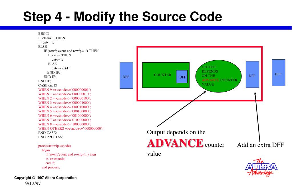 Step 4 - Modify the Source Code DFF COUNTER DFF DFF DFF BEGIN IF clear='1' THEN cnt<=1; ELSE IF (rowfp'event and rowfp='1') THEN IF cnt=9 THEN cnt<=1; ELSE cnt<=cnt+1; END IF; END IF; END IF; CASE cnt IS WHEN 9 =>csnode<="000000001"; WHEN 1 =>csnode<="000000010"; WHEN 2 =>csnode<="000000100"; WHEN 3 =>csnode<="000001000"; WHEN 4 =>csnode<="000010000"; WHEN 5 =>csnode<="000100000"; WHEN 6 =>csnode<="001000000"; WHEN 7 =>csnode<="010000000"; WHEN 8 =>csnode<="100000000"; WHEN OTHERS =>csnode<="000000000"; END CASE; END PROCESS; process(rowfp,csnode) begin if (rowfp'event and rowfp='1') then cs <= csnode; end if; end process; OUTPUT DEPENDS ON THE ADVANCE COUNTER VALUE Output depends on the ADVANCE counter value Add an extra DFF