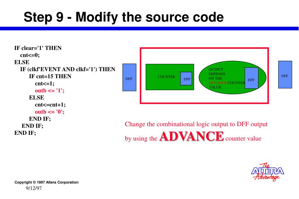 Step 9 - Modify the source code DFF COUNTER DFF DFF DFF IF clear='1' THEN cnt<=0; ELSE IF (clkf'EVENT AND clkf='1') THEN IF cnt=15 THEN cnt<=1; outb <= '1'; ELSE cnt<=cnt+1; outb <= '0'; END IF; END IF; END IF; OUTPUT DEPENDS ON THE ADVANCE COUNTER VALUE Change the combinational logic output to DFF output by using the ADVANCE counter value