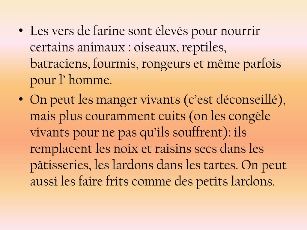 Les vers de farine sont élevés pour nourrir certains animaux : oiseaux, reptiles, batraciens, fourmis, rongeurs et même parfois pour l’ homme. • On peut les manger vivants (c’est déconseillé), mais plus couramment cuits (on les congèle vivants pour ne pas qu’ils souffrent): ils remplacent les noix et raisins secs dans les pâtisseries, les lardons dans les tartes. On peut aussi les faire frits comme des petits lardons.