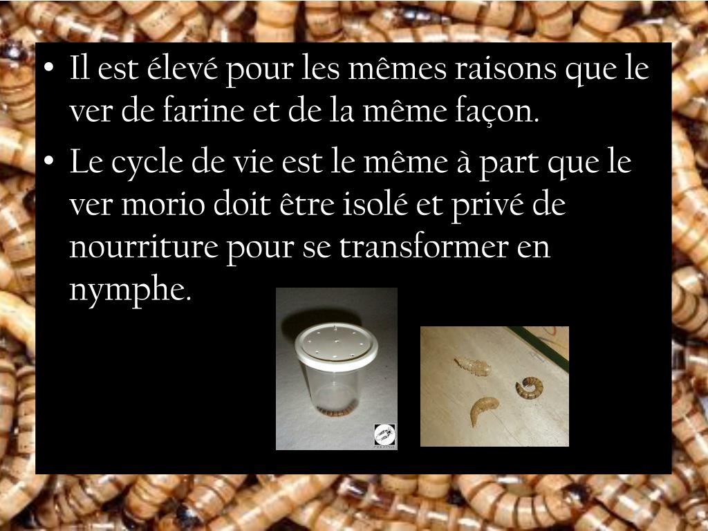 Il est élevé pour les mêmes raisons que le ver de farine et de la même façon. • Le cycle de vie est le même à part que le ver morio doit être isolé et privé de nourriture pour se transformer en nymphe.