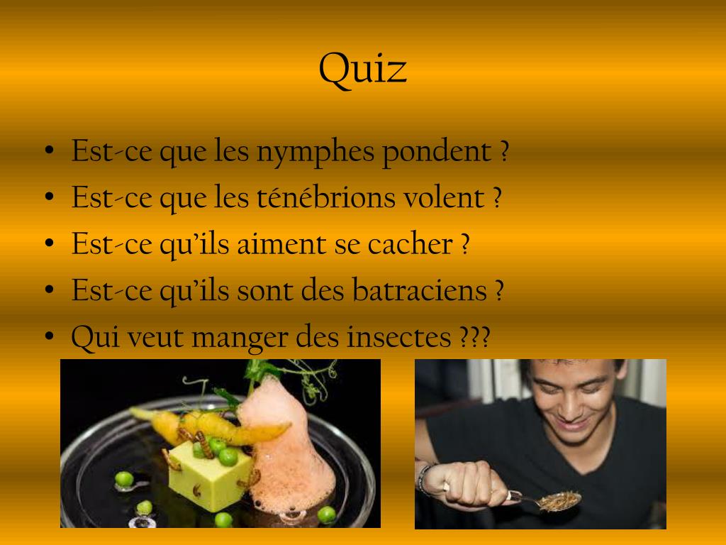 Quiz • Est-ce que les nymphes pondent ? • Est-ce que les ténébrions volent ? • Est-ce qu’ils aiment se cacher ? • Est-ce qu’ils sont des batraciens ? • Qui veut manger des insectes ???