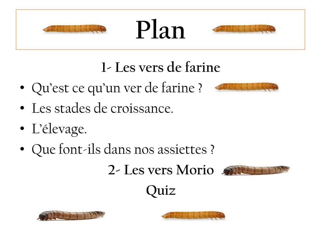 Plan 1-Les vers de farine • Qu’est ce qu’un ver de farine ? • Les stades de croissance. • L’élevage. • Que font-ils dans nos assiettes ? 2- Les vers Morio Quiz