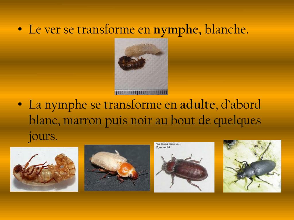 Le ver se transforme en nymphe, blanche. • La nymphe se transforme en adulte, d’abord blanc, marron puis noir au bout de quelques jours.