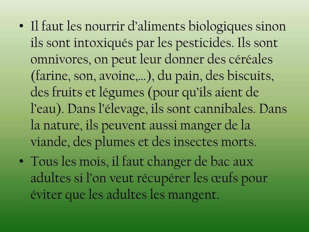 Il faut les nourrir d’aliments biologiques sinon ils sont intoxiqués par les pesticides. Ils sont omnivores, on peut leur donner des céréales (farine, son, avoine,…), du pain, des biscuits, des fruits et légumes (pour qu’ils aient de l’eau). Dans l’élevage, ils sont cannibales. Dans la nature, ils peuvent aussi manger de la viande, des plumes et des insectes morts. • Tous les mois, il faut changer de bac aux adultes si l’on veut récupérer les œufs pour éviter que les adultes les mangent.