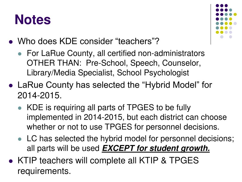 Notes • Who does KDE consider “teachers”? • For LaRue County, all certified non-administrators OTHER THAN: Pre-School, Speech, Counselor, Library/Media Specialist, School Psychologist • LaRue County has selected the “Hybrid Model” for 2014-2015. • KDE is requiring all parts of TPGES to be fully implemented in 2014-2015, but each district can choose whether or not to use TPGES for personnel decisions. • LC has selected the hybrid model for personnel decisions; all parts will be used EXCEPT for student growth. • KTIP teachers will complete all KTIP & TPGES requirements.