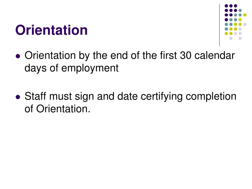 Orientation • Orientation by the end of the first 30 calendar days of employment • Staff must sign and date certifying completion of Orientation.