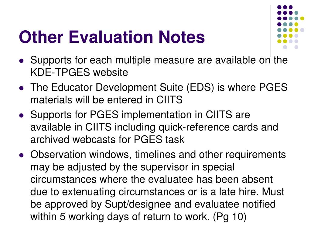 Other Evaluation Notes • Supports for each multiple measure are available on the KDE-TPGES website • The Educator Development Suite (EDS) is where PGES materials will be entered in CIITS • Supports for PGES implementation in CIITS are available in CIITS including quick-reference cards and archived webcasts for PGES task • Observation windows, timelines and other requirements may be adjusted by the supervisor in special circumstances where the evaluatee has been absent due to extenuating circumstances or is a late hire. Must be approved by Supt/designee and evaluatee notified within 5 working days of return to work. (Pg 10)