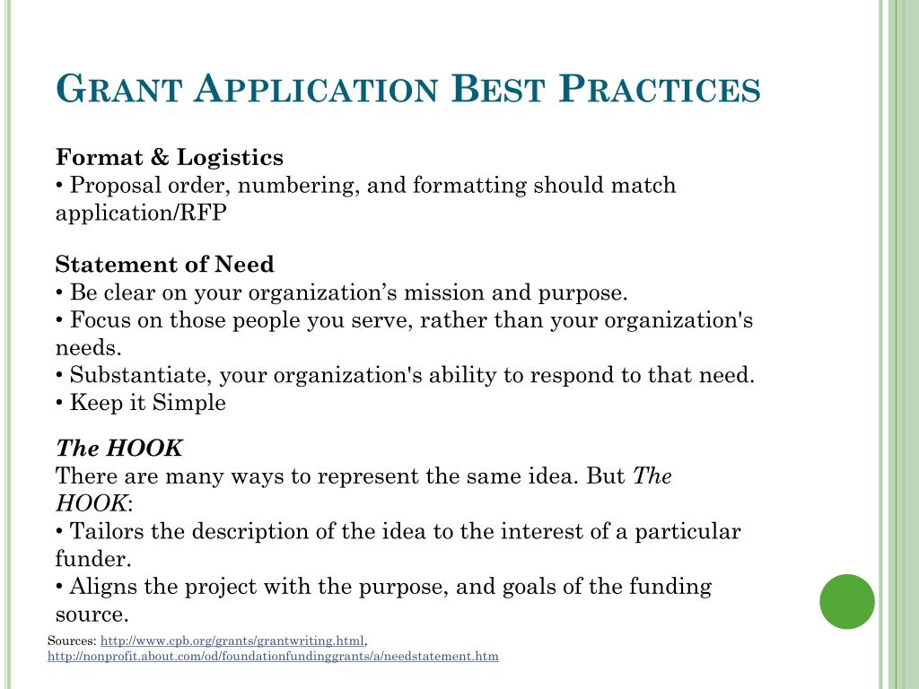 Grant Application Best Practices • Application Outline • The 5W’s • Format & Logistics • Narrative • Abstract • Statement of Need • Approach • Outcomes Generated/Method of Evaluation • Project Timeline • Credentials • The ‘Hook’ Sources: http://www.cpb.org/grants/grantwriting.html, http://nonprofit.about.com/od/foundationfundinggrants/a/needstatement.htm