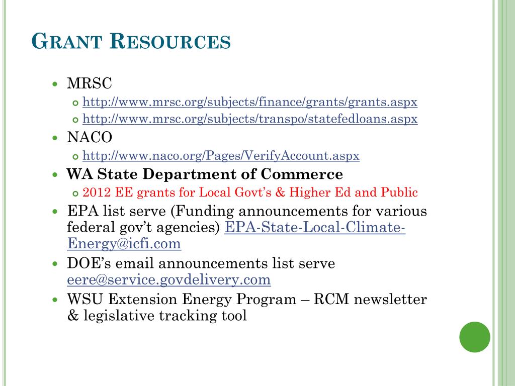 Grant Resources • MRSC • http://www.mrsc.org/subjects/finance/grants/grants.aspx • http://www.mrsc.org/subjects/transpo/statefedloans.aspx • NACO • http://www.naco.org/Pages/VerifyAccount.aspx • WA State Department of Commerce • 2012 EE grants for Local Govt’s & Higher Ed and Public • EPA list serve (Funding announcements for various federal gov’t agencies) EPA-State-Local-Climate-Energy@icfi.com • DOE’s email announcements list serve eere@service.govdelivery.com • WSU Extension Energy Program – RCM newsletter & legislative tracking tool