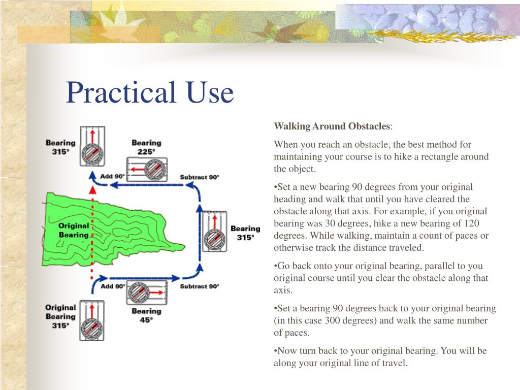 Practical Use • Walking Around Obstacles: • When you reach an obstacle, the best method for maintaining your course is to hike a rectangle around the object. • Set a new bearing 90 degrees from your original heading and walk that until you have cleared the obstacle along that axis. For example, if you original bearing was 30 degrees, hike a new bearing of 120 degrees. While walking, maintain a count of paces or otherwise track the distance traveled. • Go back onto your original bearing, parallel to you original course until you clear the obstacle along that axis. • Set a bearing 90 degrees back to your original bearing (in this case 300 degrees) and walk the same number of paces. • Now turn back to your original bearing. You will be along your original line of travel.