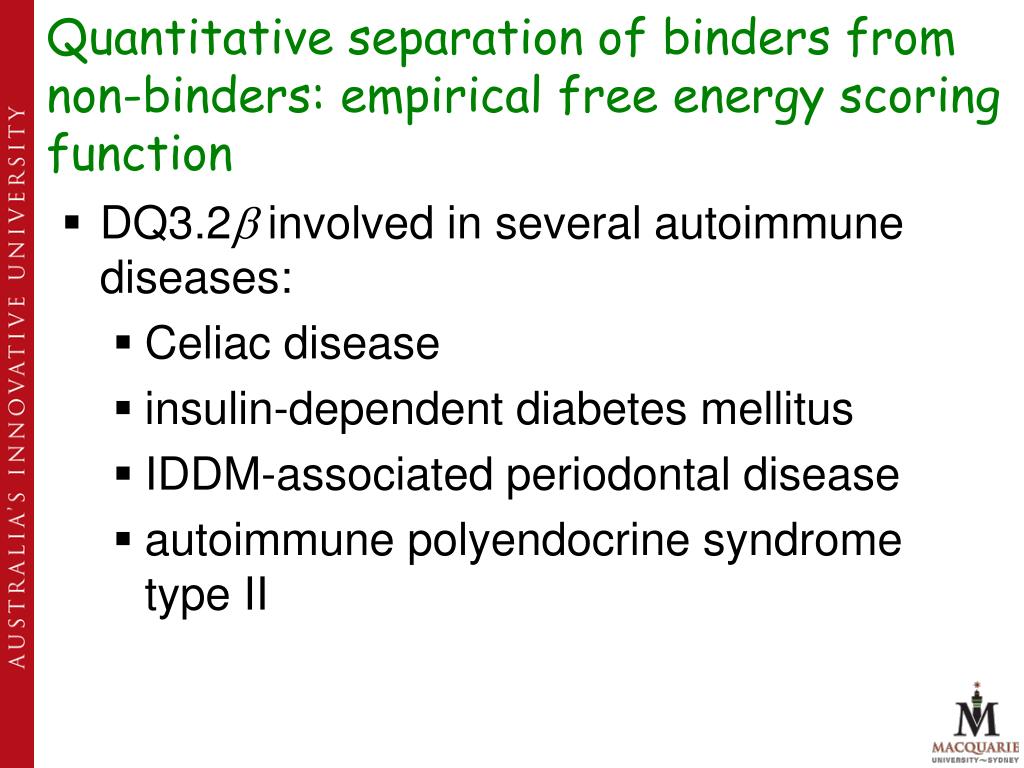 Quantitative separation of binders from non-binders: empirical free energy scoring function • DQ3.2binvolved in several autoimmune diseases: • Celiac disease • insulin-dependent diabetes mellitus • IDDM-associated periodontal disease • autoimmune polyendocrine syndrome type II