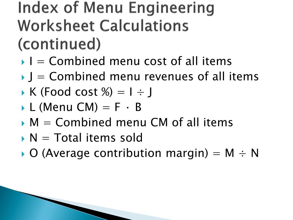 Index of Menu Engineering Worksheet Calculations (continued) • I = Combined menu cost of all items • J = Combined menu revenues of all items • K (Food cost %) = I ÷ J • L (Menu CM) = F · B • M = Combined menu CM of all items • N = Total items sold • O (Average contribution margin) = M ÷ N
