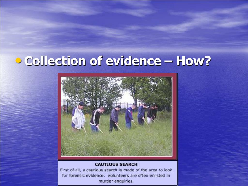 COLLECTION OF EVIDENCE • We need to ensure that forensic evidence is not contaminated. • To ensure that the following process has to occur:- • 1./ Examine the incident scene (observe and record) • 2./ Collect samples (label and seal in bags)