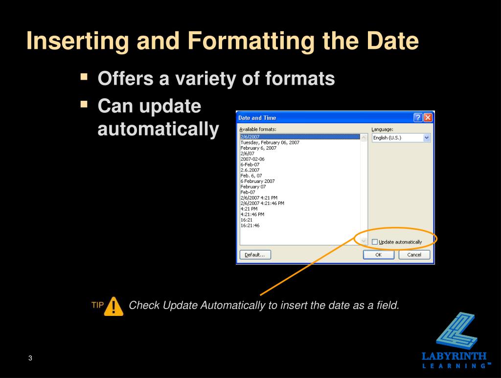 Inserting and Formatting the Date • Offers a variety of formats • Can update automatically Check Update Automaticallyto insert the date as a field.