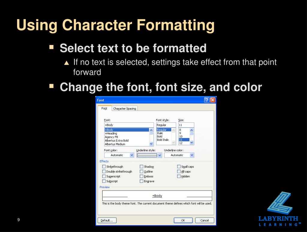 Using Character Formatting • Select text to be formatted • If no text is selected, settings take effect from that point forward • Change the font, font size, and color