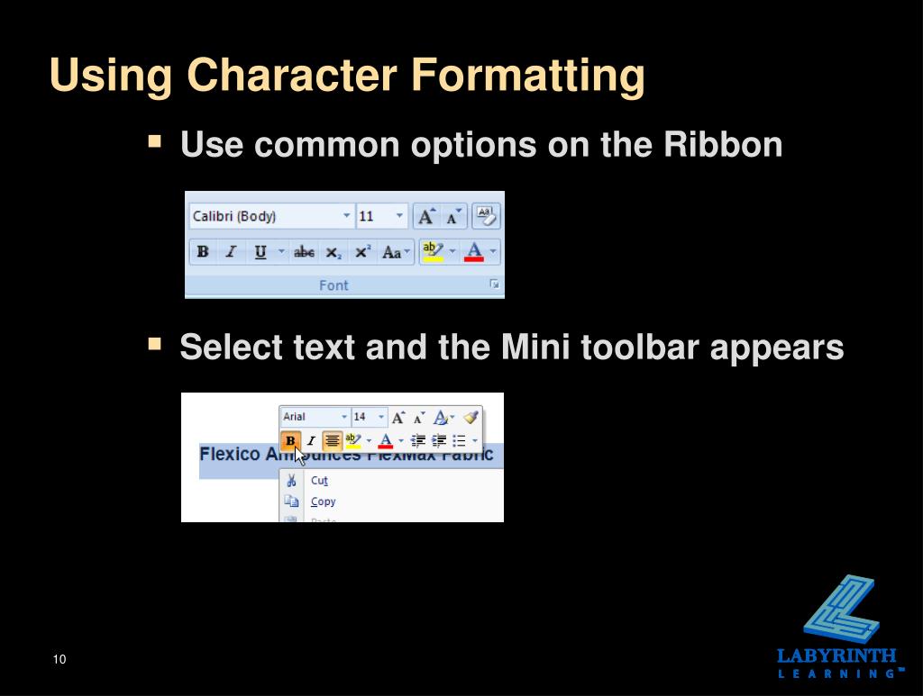 Using Character Formatting • Use common options on the Ribbon • Select text and the Mini toolbar appears