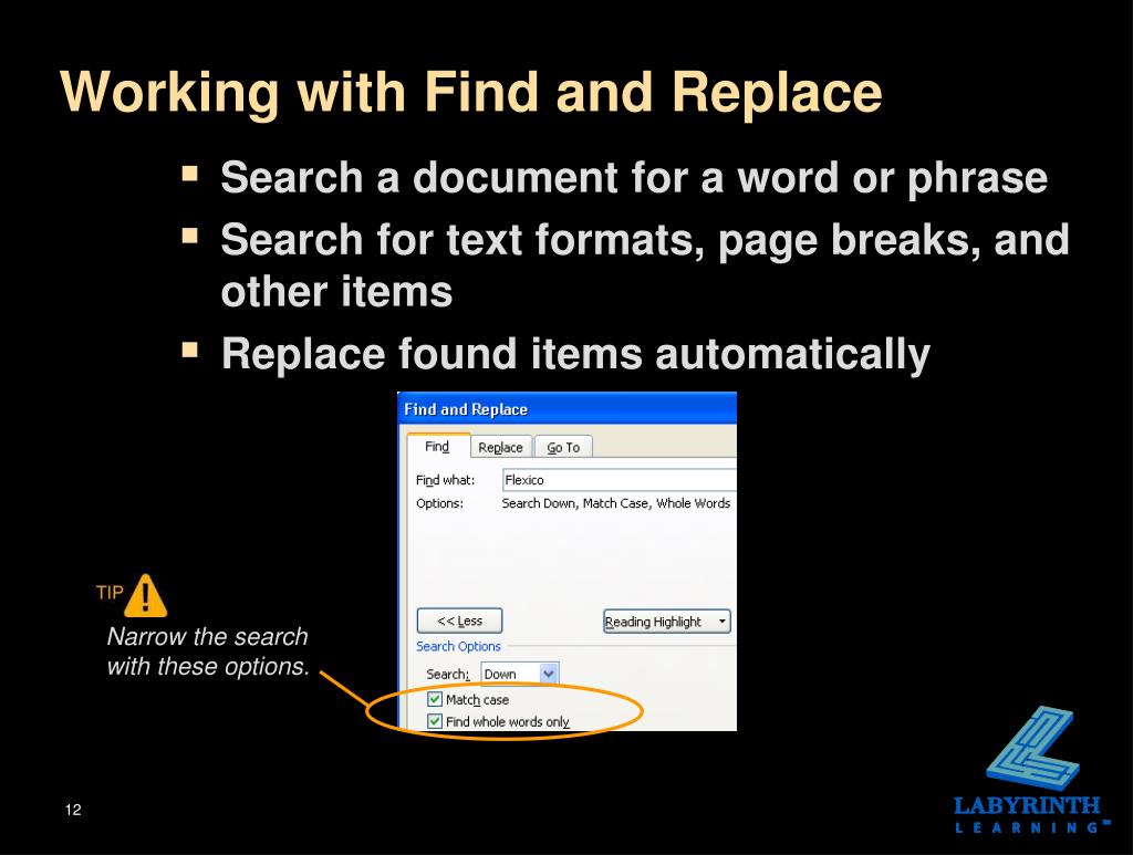 Working with Find and Replace • Search a document for a word or phrase • Search for text formats, page breaks, and other items • Replace found items automatically Narrow the search with these options.