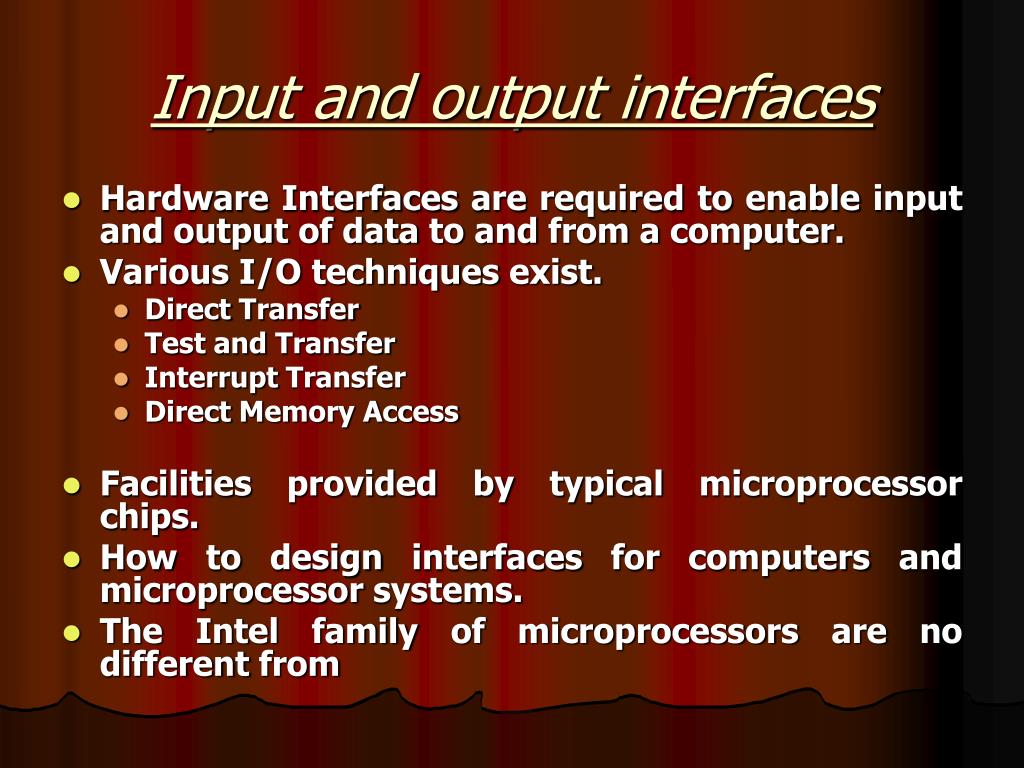 Input and output interfaces • Hardware Interfaces are required to enable input and output of data to and from a computer. • Various I/O techniques exist. • Direct Transfer • Test and Transfer • Interrupt Transfer • Direct Memory Access • Facilities provided by typical microprocessor chips. • How to design interfaces for computers and microprocessor systems. • The Intel family of microprocessors are no different from