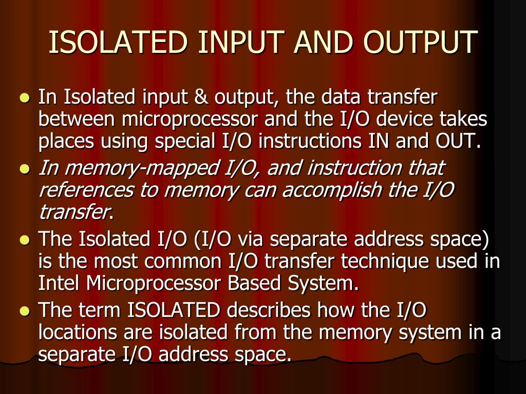 ISOLATED INPUT AND OUTPUT • In Isolated input & output, the data transfer between microprocessor and the I/O device takes places using special I/O instructions IN and OUT. • In memory-mapped I/O, and instruction that references to memory can accomplish the I/O transfer. • The Isolated I/O (I/O via separate address space) is the most common I/O transfer technique used in Intel Microprocessor Based System. • The term ISOLATED describes how the I/O locations are isolated from the memory system in a separate I/O address space.
