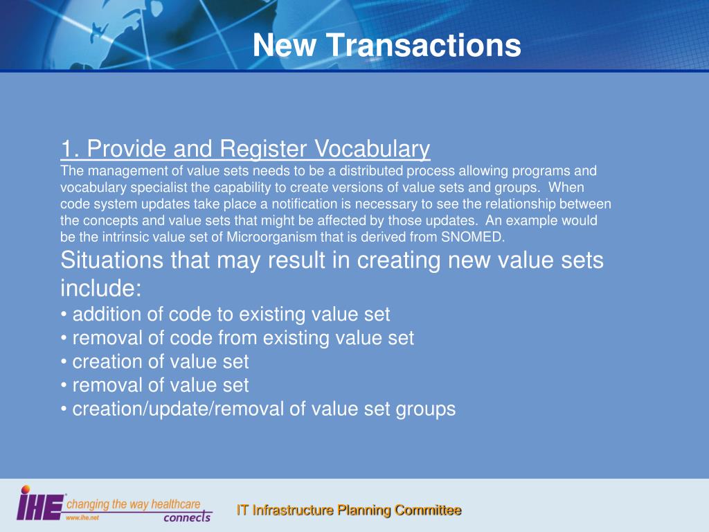 New Transactions • 1. Provide and Register Vocabulary • The management of value sets needs to be a distributed process allowing programs and vocabulary specialist the capability to create versions of value sets and groups. When code system updates take place a notification is necessary to see the relationship between the concepts and value sets that might be affected by those updates. An example would be the intrinsic value set of Microorganism that is derived from SNOMED. • Situations that may result in creating new value sets include: • addition of code to existing value set • removal of code from existing value set • creation of value set • removal of value set • creation/update/removal of value set groups