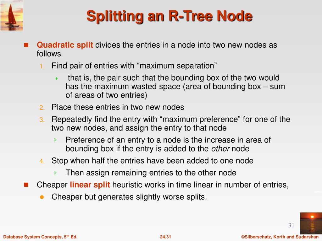 Splitting an R-Tree Node • Quadratic split divides the entries in a node into two new nodes as follows • Find pair of entries with “maximum separation” • that is, the pair such that the bounding box of the two would has the maximum wasted space (area of bounding box – sum of areas of two entries) • Place these entries in two new nodes • Repeatedly find the entry with “maximum preference” for one of the two new nodes, and assign the entry to that node • Preference of an entry to a node is the increase in area of bounding box if the entry is added to the other node • Stop when half the entries have been added to one node • Then assign remaining entries to the other node • Cheaper linear split heuristic works in time linear in number of entries, • Cheaper but generates slightly worse splits.