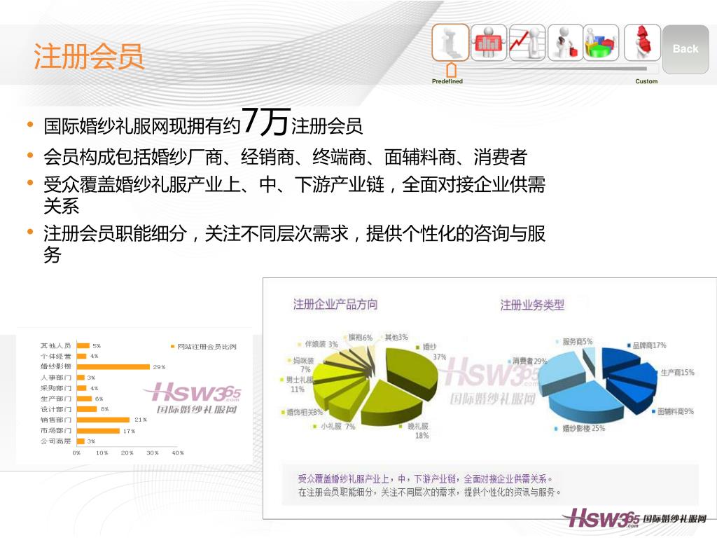 注册会员 国际婚纱礼服网现拥有约7万注册会员 会员构成包括婚纱厂商、经销商、终端商、面辅料商、消费者 受众覆盖婚纱礼服产业上、中、下游产业链,全面对接企业供需关系 注册会员职能细分,关注不同层次需求,提供个性化的咨询与服务 Back Predefined Custom