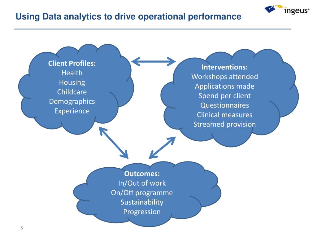 Using Data analytics to drive operational performance Client Profiles: Health Housing Childcare Demographics Experience Interventions: Workshops attended Applications made Spend per client Questionnaires Clinical measures Streamed provision Outcomes: In/Out of work On/Off programme Sustainability Progression