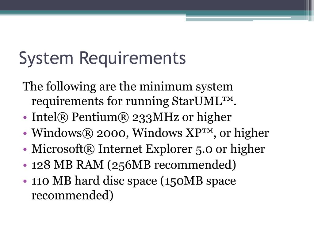 System Requirements The following are the minimum system requirements for running StarUML™. • Intel® Pentium® 233MHz or higher • Windows® 2000, Windows XP™, or higher • Microsoft® Internet Explorer 5.0 or higher • 128 MB RAM (256MB recommended) • 110 MB hard disc space (150MB space recommended)