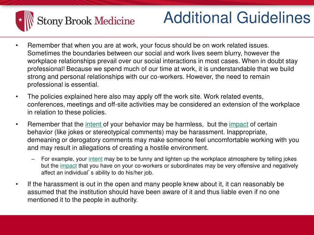 Additional Guidelines • Remember that when you are at work, your focus should be on work related issues. Sometimes the boundaries between our social and work lives seem blurry, however the workplace relationships prevail over our social interactions in most cases. When in doubt stay professional! Because we spend much of our time at work, it is understandable that we build strong and personal relationships with our co-workers. However, the need to remain professional is essential. • The policies explained here also may apply off the work site. Work related events, conferences, meetings and off-site activities may be considered an extension of the workplace in relation to these policies. • Remember that the intent of your behavior may be harmless, but the impact of certain behavior (like jokes or stereotypical comments) may be harassment. Inappropriate, demeaning or derogatory comments may make someone feel uncomfortable working with you and may result in allegations of creating a hostile environment. • For example, your intent may be to be funny and lighten up the workplace atmosphere by telling jokes but the impact that you have on your co-workers or subordinates may be very offensive and negatively affect an individual’s ability to do his/her job. • If the harassment is out in the open and many people knew about it, it can reasonably be assumed that the institution should have been aware of it and thus liable even if no one mentioned it to the people in authority.