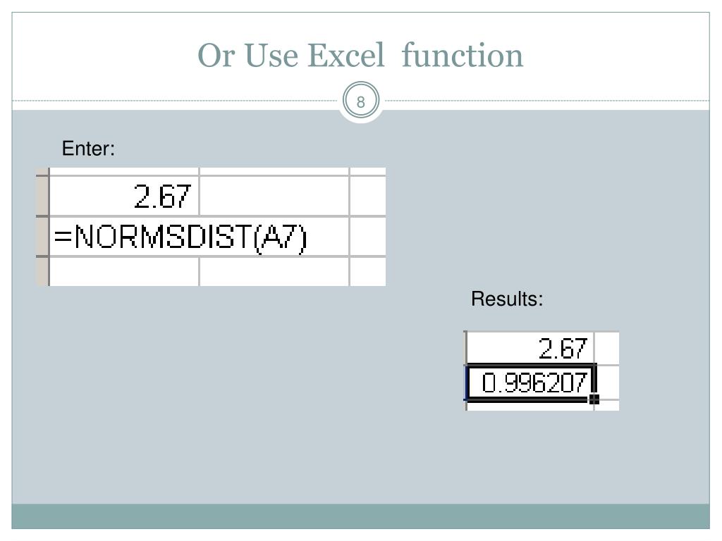 Using Table of the Normal Distribution Z = 2.67 Table found in text page A-1 back of book Look up 2.6 in the row, and .07 in the column. The intersection is the area to the left, or probability