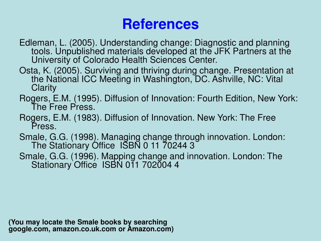 References Edleman, L. (2005). Understanding change: Diagnostic and planning tools. Unpublished materials developed at the JFK Partners at the University of Colorado Health Sciences Center. Osta, K. (2005). Surviving and thriving during change. Presentation at the National ICC Meeting in Washington, DC. Ashville, NC: Vital Clarity Rogers, E.M. (1995). Diffusion of Innovation: Fourth Edition, New York: The Free Press. Rogers, E.M. (1983). Diffusion of Innovation. New York: The Free Press. Smale, G.G. (1998). Managing change through innovation. London: The Stationary Office ISBN 0 11 70244 3 Smale, G.G. (1996). Mapping change and innovation. London: The Stationary Office ISBN 011 702004 4 (You may locate the Smale books by searching google.com, amazon.co.uk.com or Amazon.com)