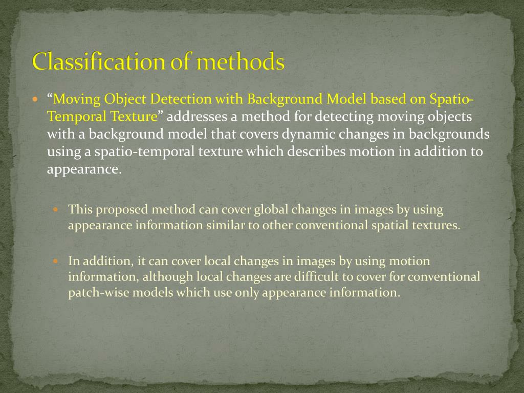 Classification of methods • “Moving Object Detection with Background Model based on Spatio-Temporal Texture” addressesa method for detecting moving objects with a background model that covers dynamic changes in backgrounds using a spatio-temporal texture which describes motion in addition to appearance. • This proposed method can cover global changes in images by using appearance information similar to other conventional spatial textures. • In addition, it can cover local changes in images by using motion information, although local changes are difficult to cover for conventional patch-wise models which use only appearance information.