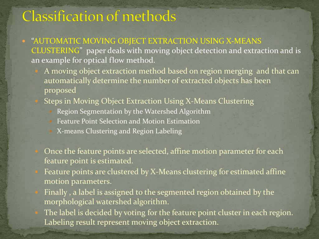 Classification of methods • “AUTOMATIC MOVING OBJECT EXTRACTION USING X-MEANS CLUSTERING” paper deals with moving object detection and extraction and is an example for optical flow method. • A moving object extraction method based on region merging and that can automatically determine the number of extracted objects has been proposed • Steps in Moving Object Extraction Using X-Means Clustering • Region Segmentation by the Watershed Algorithm • Feature Point Selection and Motion Estimation • X-means Clustering and Region Labeling • Once the feature points are selected, affine motion parameter for each feature point is estimated. • Feature points are clustered by X-Means clustering for estimated affine motion parameters. • Finally , a label is assigned to the segmented region obtained by the morphological watershed algorithm. • The label is decided by voting for the feature point cluster in each region. Labeling result represent moving object extraction.