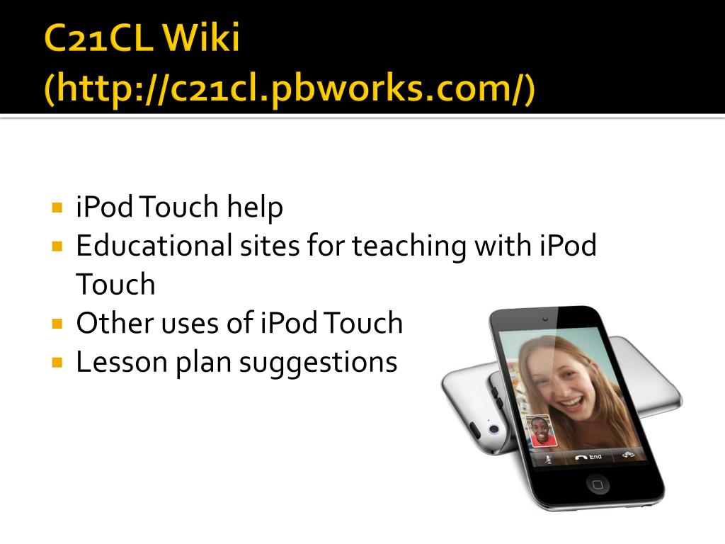 C21CL Wiki (http://c21cl.pbworks.com/) • iPod Touch help • Educational sites for teaching with iPod Touch • Other uses of iPod Touch • Lesson plan suggestions