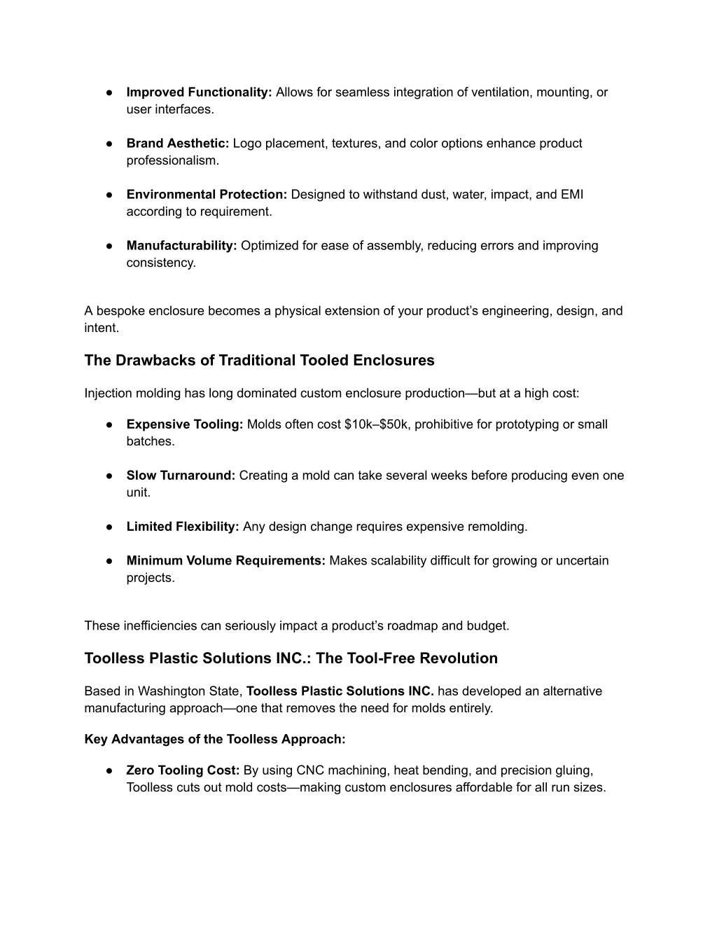 ● Improved Functionality: Allows for seamless integration of ventilation, mounting, or user interfaces. ● Brand Aesthetic: Logo placement, textures, and color options enhance product professionalism. ● Environmental Protection: Designed to withstand dust, water, impact, and EMI according to requirement. ● Manufacturability: Optimized for ease of assembly, reducing errors and improving consistency. A bespoke enclosure becomes a physical extension of your product’s engineering, design, and intent. The Drawbacks of Traditional Tooled Enclosures Injection molding has long dominated custom enclosure production—but at a high cost: ● Expensive Tooling: Molds often cost $10k–$50k, prohibitive for prototyping or small batches. ● Slow Turnaround: Creating a mold can take several weeks before producing even one unit. ● Limited Flexibility: Any design change requires expensive remolding. ● Minimum Volume Requirements: Makes scalability difficult for growing or uncertain projects. These inefficiencies can seriously impact a product’s roadmap and budget. Toolless Plastic Solutions INC.: The Tool-Free Revolution Based in Washington State, Toolless Plastic Solutions INC. has developed an alternative manufacturing approach—one that removes the need for molds entirely. Key Advantages of the Toolless Approach: ● Zero Tooling Cost: By using CNC machining, heat bending, and precision gluing, Toolless cuts out mold costs—making custom enclosures affordable for all run sizes.