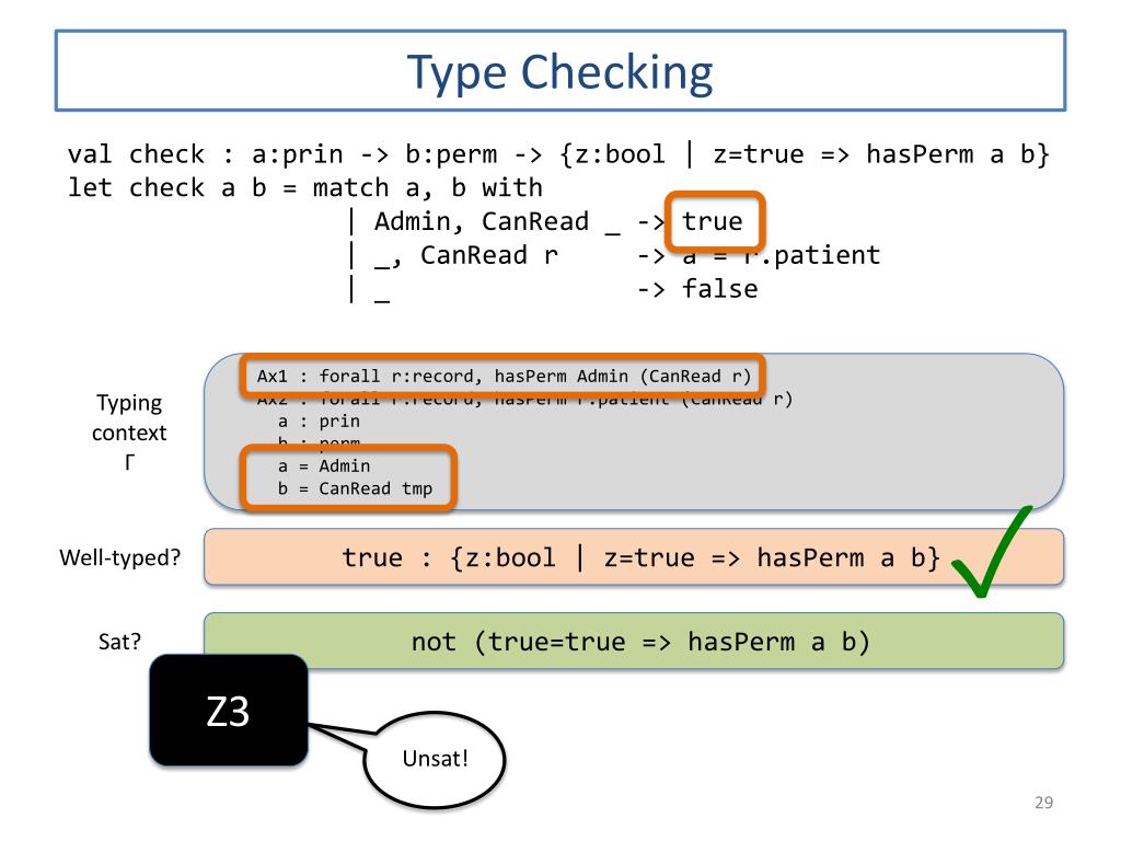 Type Checking val check : a:prin -> b:perm -> {z:bool | z=true => hasPerm a b} let check a b = match a, b with | Admin, CanRead _ -> true | _, CanRead r -> a = r.patient | _ -> false TypingcontextΓ Ax1 : forall r:record, hasPerm Admin (CanRead r) Ax2 : forall r:record, hasPermr.patient (CanRead r) a : prin b : perm ✓ Well-typed? false : {z:bool | z=true => hasPerm a b} Sat? not (false=true => hasPerm a b) Z3 Unsat!