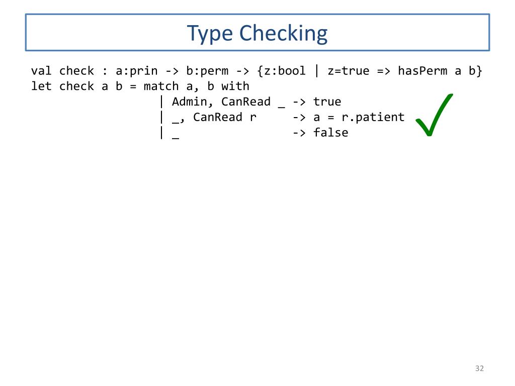 Type Checking val check : a:prin -> b:perm -> {z:bool | z=true => hasPerm a b} let check a b = match a, b with | Admin, CanRead _ -> true | _, CanRead r -> a = r.patient | _ -> false ✓
