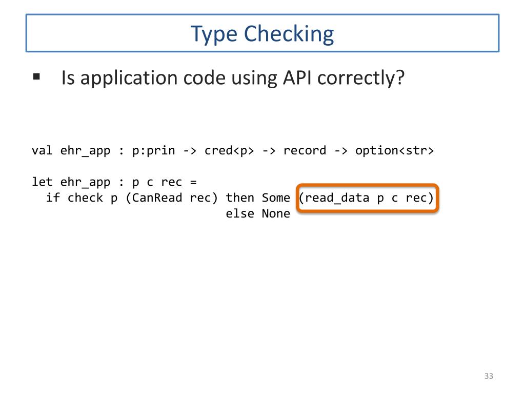 Type Checking • Is application code using API correctly? valehr_app : p:prin -> cred<p> -> record -> option<str> let ehr_app : p c rec = if check p (CanReadrec) then Some (read_data p c rec) else None