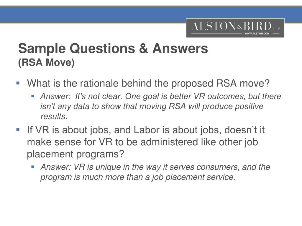 Sample Questions & Answers (RSA Move) • What is the rationale behind the proposed RSA move? • Answer: It’s not clear. One goal is better VR outcomes, but there isn’t any data to show that moving RSA will produce positive results. • If VR is about jobs, and Labor is about jobs, doesn’t it make sense for VR to be administered like other job placement programs? • Answer: VR is unique in the way it serves consumers, and the program is much more than a job placement service.