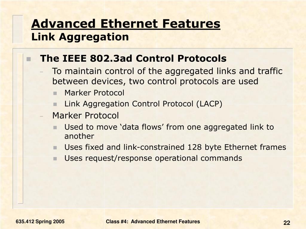 Advanced Ethernet FeaturesLink Aggregation • The IEEE 802.3ad Control Protocols • To maintain control of the aggregated links and traffic between devices, two control protocols are used • Marker Protocol • Link Aggregation Control Protocol (LACP) • Marker Protocol • Used to move ‘data flows’ from one aggregated link to another • Uses fixed and link-constrained 128 byte Ethernet frames • Uses request/response operational commands Class #4: Advanced Ethernet Features