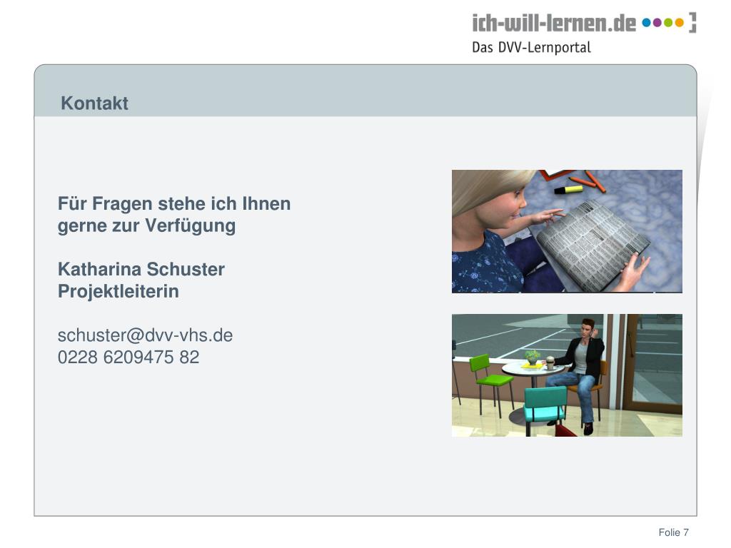 Kontakt • Für Fragen stehe ich Ihnen gerne zur Verfügung • Katharina Schuster • Projektleiterin • schuster@dvv-vhs.de • 0228 6209475 82 Folie 7
