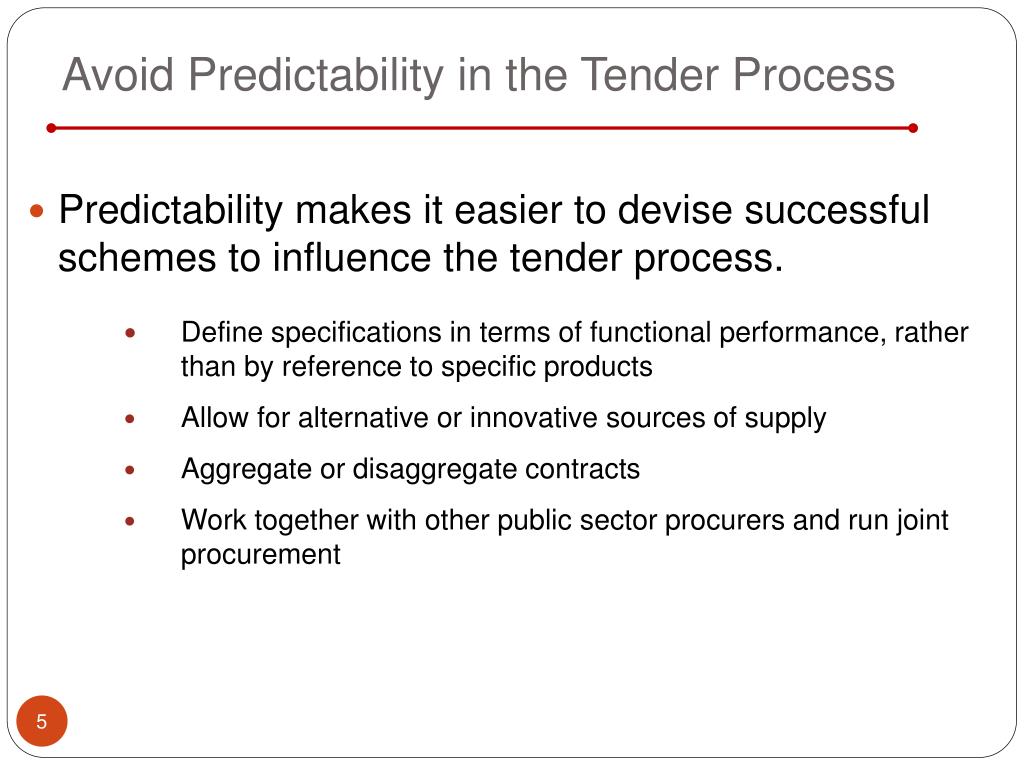 AvoidPredictability in the Tender Process • Predictability makes it easier to devise successful schemes to influence the tender process. • Define specifications in terms of functional performance, rather than by reference to specific products • Allow for alternative or innovative sources of supply • Aggregate or disaggregate contracts • Work together with other public sector procurers and run joint procurement